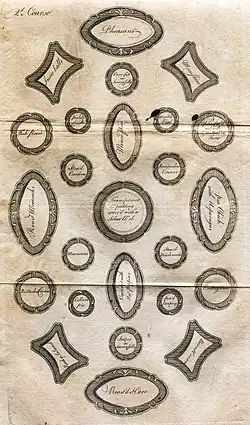 The book, intended for "a burgeoning middle class that required explanation and elucidation", provided an accurate description of how to serve an elegant meal à la française, complete with two fold-out engravings of the layout of a table with 25 "prettily-shaped" and symmetrically-arranged serving-dishes "laid in generous profusion on the table", each annotated with the name of the appropriate recipe. It is not clear whether the term "cover" for the layout of such a "Grand meal" is an acknowledgement of the French couvert, as it may simply mean, with Hannah Glasse, "a large table to cover".[17]