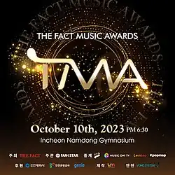 The Fact Music Awards (Korean: 더팩트 뮤직 어워즈; abbreviated as TMA) is an awards ceremony hosted by The Fact and organized by Fan N Star that recognizes major contributors to the Hallyu wave.[1] Established in 2019, The Fact Music Awards determines its winners through objective data from Circle Chart (formerly Gaon Music Charts), a panel of judges, and the support and participation scores of fans at home and abroad.[2]