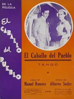A third, El caballo del pueblo (The people's horse; Manuel Romero, 1935) depicts a father, Gerardo Peña (Juan Mangiante), who forces his daughter Esther (Irma Córdoba) to become engaged to his dishonest associate (Enrique Serrano).