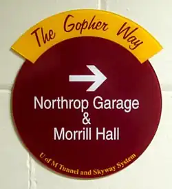 The Gopher Way is a system of discontinuous tunnels and skyways on the University of Minnesota, Twin Cities campus which connects many buildings. The system is open during the normal business hours of the buildings it occupies, while some portions are open 24 hours a day. Access policies are posted at the entrances of connected buildings.[1] It is one of three skyway/tunnel systems in the Twin Cities area. The other two occupy both downtown Minneapolis and downtown St. Paul.