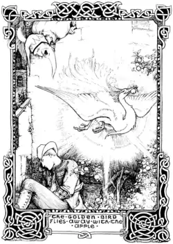![]() The golden bird steals the apples under the gardener's son's watch. Frontispice illustration of More Celtic Fairy Tales by John D. Batten (1895). | |