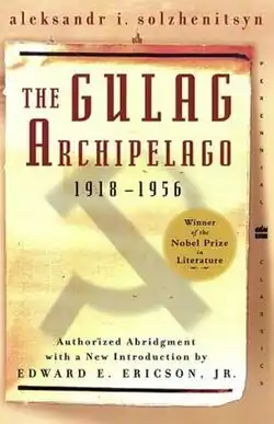 The Gulag Archipelago: An Experiment in Literary Investigation (Russian: Архипелаг ГУЛАГ, romanized: Arkhipelag GULAG) is a three-volume nonfiction series written between 1958 and 1968 by Russian writer Aleksandr Solzhenitsyn, a Soviet dissident. It was first published in 1973 by the Parisian publisher YMCA-Press,[1][2] and it was translated into English and French the following year. It explores a vision of life in what is often known as the Gulag, the Soviet labour camp system. Solzhenitsyn constructed his highly detailed narrative from various sources including reports, interviews, statements, diaries, legal documents, and his own experience as a Gulag prisoner.