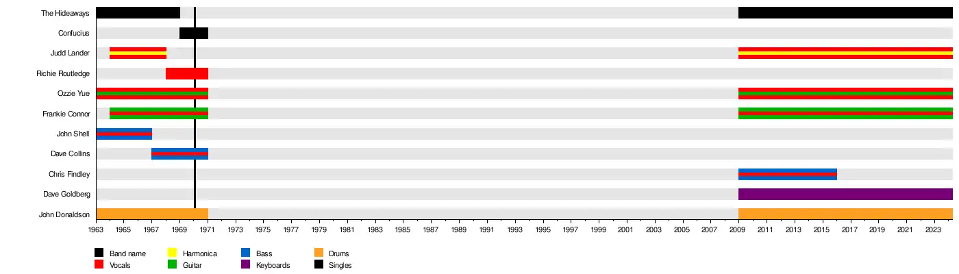The band formed in about October 1963 by Ozzie Yue (guitar, vocals), John Shell (bass guitar) and John Donaldson (drums); Frankie Connor joined three months later, followed by Judd Lander on harmonica.[1]