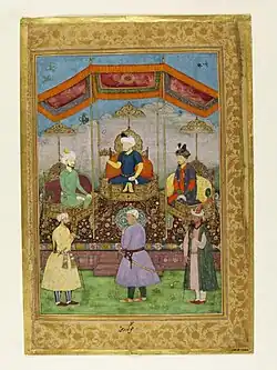 This deliberate use of Bijapuri and Safavid elements, while the subject itself is taken from Mughal art, shows the intent of the artists, to depict the Adil Shahi rulers as distinct from, but equal in stature to, their Mughal counterparts.[8]