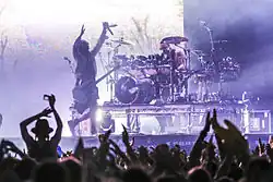 The band's first live performance of The Hunting Party album cycle was on May 24, 2014, at the KMFA Day music festival, in which they headlined. The band performed "Guilty All the Same", "Until It's Gone" and "Wastelands" for the first time.[56] The band also performed as headliners at Rock in Rio Lisboa VI on May 30, 2014. During the performance, Shinoda tossed promotional singles containing the studio version of "Wastelands" out into the open audience, days before the song's official single release.[57] Linkin Park are also set to embark on a double-headline tour of North America with Thirty Seconds to Mars in support of both The Hunting Party and Thirty Seconds to Mars' 2013 album Love, Lust, Faith and Dreams.[58] The tour, dubbed the Carnivores Tour, spanned 25 dates in August and September 2014, with American rock band AFI serving as opening act during the entire tour.[59] The band held another tour named as "The Hunting Party Tour", which started on May 30, 2014. However, some of the shows on the tour were cancelled due to Bennington breaking his leg.[60][61][62]