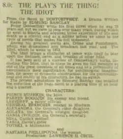 Barclay's adaptation has been called a "radio masterpiece".[3] It was one of a series of classical novel adaptations by Barclay for the Australian Broadcasting Corporation (ABC); Leslie Rees listed The Idiot among the best of these.[4]