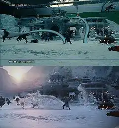 Due to reality-based expectations, fire and water were the hardest elements to effectively bend, and because of particle work which was unable to be rendered in hardware, earth bending also was difficult to create.[47] With water, the variety in different scales required Helman and his team to create different techniques. The concept for air was derived from the animation of the television series.[47] To create the air bending effect, visual effects art director Christian Alzman and digital matte department supervisor Barry Williams explained that seeing dust and snow particles, rather than seeing the air itself, helped shape the real-world effect of bending the element. Before the bending effects could be applied, though, the actor's movements had to be matched; Shyamalan, therefore, wanted each character's bending styles to be unique to fit with their unique personalities.[47]