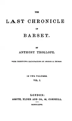 The Last Chronicle of Barset is a novel by English author Anthony Trollope, published in 1867. It is the sixth and final book in the Chronicles of Barsetshire series, preceded by The Small House at Allington. The novel is set in the fictional county of Barsetshire and deploys characters from the earlier novels, whilst concentrating on the personnel associated with the cathedral. The main narrative thread is catalysed by the loss of a cheque which had been in the possession of the Reverend Josiah Crawley, and the subsequent reactions of his friends and enemies. Trollope drew inspiration from his father and mother in the creation of the Rev. and Mrs. Crawley.[1] In his autobiography, Trollope regarded this novel as "the best novel I have written.",[2] although later commentators do not agree with this judgement.[3] The serialisation was illustrated by G H Thomas who was selected by the publisher, though Trollope had wished for Millais who had illustrated The Small House at Allington.[4]