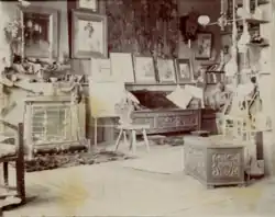 Clara, a member of the Woman's Art Club of New York, worked in oil, watercolor and pastel and was known for portraits, studies of flowers and views of Cape Cod, Holland, Cornwall, Brittany and Venice. (Her works are usually signed C. W. Lathrop.) She exhibited at venues including the Paris Salon (1891), 1893 World's Columbian Exposition (Palace of Fine Arts), Pennsylvania Academy of the Fine Arts (1887, 1891, 1895, 1898), Art Institute of Chicago (1889, 1892, 1896, 1898), Boston Art Club (1890, 1892), American Water Color Society (1892, 1898), Art Association of Indianapolis (1892), Gill's Art Galleries in Springfield (1889, 1890), Woman's Art Club (1892, 1893, 1894), National Academy of Design (1892, 1893), the Art Club of Philadelphia (1892, 1893) and the New York Water Color Club (1893, 1895, 1897). Critics lauded her work in publications including The Art Amateur,[2] Quarterly Illustrator[3] and the New York Times.[4] The Springfield Republican praised her skill at rendering “every delicate shade imaginable”[5] and observed that Susie “has a genius for figure drawing and character.”[6] Susie worked mainly in watercolor and pen and ink, specializing in scenes of Greek mythology and rural Massachusetts. She exhibited at the Art Institute of Chicago (1889), American Water Color Society (1889, 1892, 1893), Boston Art Club (1890, 1891) and Art Club of Philadelphia (1892). She illustrated M. Helen Beckwith's children's book, In Mythland,[7] and published sketches of local scenery in Picturesque Hampshire[8] and The History of Florence, Massachusetts.[9] Bessie, a member of the Society of Arts and Crafts of Boston, tooled leather and wood for furniture and panels in medieval and Renaissance styles. She showed at the 1893 World's Columbian Exposition (Woman's Building's Record Room), Detroit Architectural Club (1909) and Smith College (1913, 1914). The Springfield Republican described her furniture as evidence that her “hand is sure and her eye true."[10] The sisters held group shows and intellectual salons at their studio in downtown Northampton (Bernard Berenson lectured there in 1894), which was draped with fishnets and packed with paintings, prints, embroideries, woodcarvings and ceramics.[11][12]