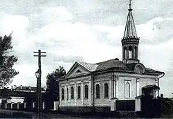 The Church is situated on the east side of the square parade ground in a fortress in the city center, near the Irtysh River. This building is an architectural monument of the late Siberian baroque. The movement of architectural forms, flexibility, richness of stucco give emphasis and put it among the best architectural monuments of Omsk of the 18th century. The project was completed in the military office of the Siberian Corps, commanded by Lieutenant-General I.I. Springer. This church represents a baroque rectangular building with a large semi-circular altar. The main facade has centrally symmetric composition: in the middle there is a risalit, cutting through three arched windows with responders between them and completing by the gable, side parts have two arched windows, rounded corners and pilaster side. The entry of the church was on the south side. Initially it had a doorway with columns, and later the church kept the high porch with rampart of ornately shaped trellis-work and canopy with elegant hammered metal consoles. Until the late 19th century, over the building there was the baroque octagonal tower with a dome. Later the Gothic tower was built in 1906—1908 over it. These changes in the appearance of the building connected with the peculiarities of the national identity of the Lutherans. Therefore, the replacement of the international Baroque style in the forms of towers for the Gothic one was made with an intention to give the church more 'German' appearance. But it demounted in 1970. Decorative elements: The walls are smooth with pilasters, cornice is anfractuous. Semicircular windows are decorated with architraves. Interior is not preserved.[1]