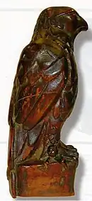 Fred Sexton, an American artist, sculpted the Maltese Falcon statuette prop for the film.[21] The "Maltese Falcon" itself was based on the "Kniphausen Hawk", a ceremonial pouring vessel made in 1697 for Georg Wilhelm von Kniphausen, Count of the Holy Roman Empire. It is modeled after a hawk perched on a rock and is encrusted with red garnets, amethysts, emeralds, and sapphires. It is currently owned by the Cavendish family[22] and is part of the collection at Chatsworth House.[23]