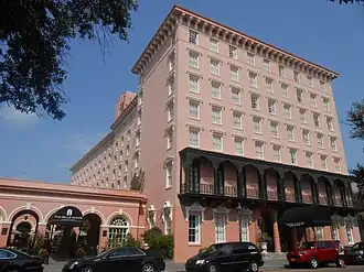 Construction of the new hotel began on April 3, 1969.[11] The hotel was designed by the New Orleans firm of Curtis and Davis, with the Ruscon Construction Company as the general contractor, and local architects Simons, Lapham, Mitchell and Small consulting on exterior design and historic details. The original 79-foot iron balcony across the front was replaced with a 75-foot version, and some changes were made to the window cornices (the cornices on the first two floors were cast from originals, but upper floors received different cornices than the original).[12] The chandelier in the Meeting Street lobby was acquired from Belle Meade Plantation, a Nashville, Tennessee house that was designed by William Strickland.[13]