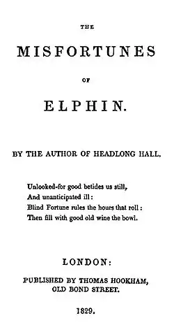 The Misfortunes of Elphin is an 1829 short historical romance by Thomas Love Peacock, set in 6th century Wales, which recounts the adventures of the bard Taliesin, the princes Elphin ap Gwythno and Seithenyn ap Seithyn, and King Arthur. Peacock researched his story from early Welsh materials, many of them untranslated at the time; he included many loose translations from bardic poetry, as well as original poems such as "The War-Song of Dinas Vawr". He also worked into it much satire of the Tory attitudes of his own time. Elphin has been highly praised for its sustained comic irony, and by some critics is considered the finest Arthurian literary work of the Romantic period.[1][2]