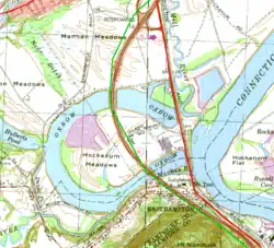 Historically, the Oxbow was connected directly to the Connecticut river as a large U-shaped bend.[2] In 1840, flood waters cut through the narrow section, separating the Oxbow from the main river and the current. In the early 1900s, the Oxbow was used extensively for logging operations, as a holding area for logs sent down river. The northern end was later cut off to build Interstate 91, which runs between the Oxbow and the Connecticut River. The Connecticut River is still accessible by a channel made under the Interstate 91 and U.S. Route 5 bridges.[3]