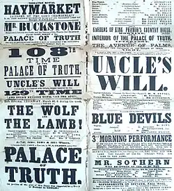 - ^ An advertisement in The Times, 22 April 1871, p. 8, states that the 135th performance would be the "last but five" and that a new piece would open at the theatre on 29 April. The Times, 2 May 1871, p. 12, confirms that The Palace of Truth had been replaced by other works at the Haymarket and that An English Gentleman by H. J. Byron, starring Edward Sothern, would open on 6 May.