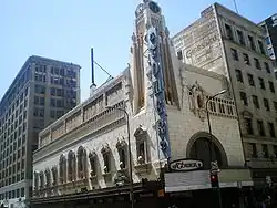 Crowley and his crew searched Los Angeles for almost 70 locations that resembled fin de siècle London.[15] Jonathan Nolan visited Colorado Springs to research Nikola Tesla and based the electric-bulb scene on actual experiments Tesla conducted.[12] Nathan Crowley helped design the scene for Tesla's invention; It was shot in the parking lot of the Mount Wilson Observatory.[15] Influenced by a "Victorian modernist aesthetic," Crowley chose four locations in the Broadway theater district in downtown Los Angeles for the film's stage magic performances: the Los Angeles Theatre, the Palace Theatre, the Los Angeles Belasco, and the Tower Theatre.[20] Crowley also turned a portion of the Universal back lot into Victorian London.[21] Osgood Castle in Colorado was also used as a location.[22]