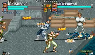The Punisher follows the same side-scrolling beat'em up formula Capcom established in Final Fight (1989) and Captain Commando (1991)[2] as the protagonists engage ordinary foes and stage bosses. As in most beat'em up games of this kind, progression through the game is achieved by systematically dispatching all varieties of henchmen to proceed onward to either right or left, and defeating the ringleaders whom the player(s) encounter at the boss stage of each level. Much like the limited roster of playable characters in Street Fighter (1987), the size, abilities and tactics of both player characters (the Punisher and Nick Fury) are essentially interchangeable; they both use the same basic moves, such as punches, kicks and throws, which can be chained into combos, as well as similar special attacks.[3][4] Basic attacks can be combined to cause extra damage to enemies.[5] The game is presented in a comic book-like style, including featuring on-screen onomatopoeias such as "BLAM!" for gunshots.[6]