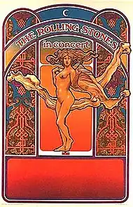 Tour manager Sam Cutler introduced the Rolling Stones as "the greatest rock and roll band in the world", a title he had first bestowed upon them at their concert in London's Hyde Park the previous July.[10] The tour set lists were derived mostly from 1968's Beggars Banquet album and the forthcoming Let It Bleed. The performance itself featured the Stones showmanship that would become familiar: Charlie Watts businesslike drumming leavened by an occasional wry smile, Bill Wyman's undertaker persona on bass, the guitar interplay of Mick Taylor with Keith Richards, and most of all Mick Jagger's prancing, strutting, leering and preening in front of the crowd.[5][8] "Ah think I've busted a button on my trousers, I hope they don't fall down" he teased the audience. "You don't want my trousers to fall down, now do ya?"[11] At one point in some shows, Jagger motioned for the audience to rush past ushers to the edge of the stage;[7] of the group's reaction to the crowd's fervor, a spokesman said, "They loved it."[7]