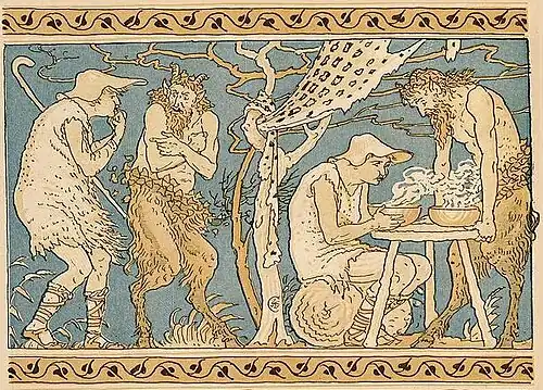 There are Greek versions and a late Latin version of the fable by Avianus. In its usual form, a satyr or faun comes across a traveller wandering in the forest in deep winter. Taking pity on him, the satyr invites him home. When the man blows on his fingers, the satyr asks him what he is doing and is impressed when told that he can warm them that way. But when the man blows on his soup and tells the satyr that this is to cool it, the honest woodland creature is appalled at such double dealing and drives the traveller from his cave. There is an alternative version in which a friendship between the two is ended by this behaviour.
