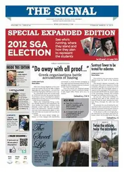 The newspaper is operated by a staff of approximately 100 students, subdivided into editorial, production, marketing and advertising departments. Although Georgia State offers degrees in journalism, The Signal allows students from any major within the university to contribute. It is funded primarily by print and digital advertising, while its printing costs are paid for by student fees.[8] It runs its website independent from the school and the current URL (georgiastatesignal.com) was launched in 2012 after over a decade of the paper publishing through the College Publisher system (at gsusignal.com).