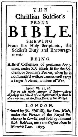 ![]() Title page of The Souldiers Pocket Bible, 1643 | |