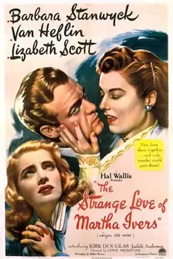 The Strange Love of Martha Ivers is a 1946 American noir tragedy film directed by Lewis Milestone and starring Barbara Stanwyck, Van Heflin and Lizabeth Scott. Kirk Douglas appears in his film debut. It follows a man who is reunited with his childhood friend and her husband; both the childhood friend and her husband believe that the man knows the truth about the mysterious death of the woman's wealthy aunt years prior. The screenplay was written by Robert Rossen (and an uncredited Robert Riskin), adapted from the short story "Love Lies Bleeding" by playwright John Patrick.