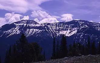 The Thunderer el. 10,558 feet (3,218 m) is a mountain peak in the northeast section of Yellowstone National Park, in the Absaroka Range of the U.S. state of Wyoming. Named by members of the Arnold Hague Geological Survey of 1885 for its propensity to attract thunderstorms, the mountain is a long high ridge just north of Mount Norris. Prior to 1885, the peak was merely considered a high ridge extending north from Mount Norris rather than a separately named peak.[3] The Thunderer is easily visible from the northeast entrance road as it passes up the Soda Butte Creek canyon.