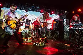 ![]() The Tins performing at Mercury Lounge in July 2018. From Left To Right: Adam Putzer, David Muntner, Justin John Smith, and Michael Santillo | |