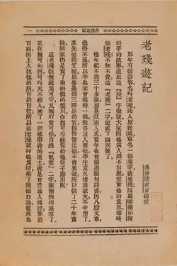 The first 13 chapters were serialized in the bi-weekly Xiuxiang Xiaoshuo (simplified Chinese: 绣像小说; traditional Chinese: 繡像小說; Illustrated Fiction) from March 1903 to January 1904, in issues 9 through 18. It was published in the Tianjin Riri Xinwen Bao (simplified Chinese: 天津日日新闻报; traditional Chinese: 天津日日新聞報; lit. 'Tientsin Daily News'[4]) in a 20 chapter version with a prologue.[5]