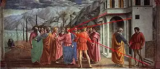 Masaccio is often compared to contemporaries like Donatello and Brunelleschi as a pioneer of the renaissance, particularly for his use of single-point perspective.[1] One technique that was unique to Masaccio, however, was the use of atmospheric, or aerial perspective. Both the mountains in the background, and the figure of Peter on the left are dimmer and paler than the objects in the foreground, creating an illusion of depth. This technique was known in ancient Rome, but was considered lost until reinvented by Masaccio.[1]
