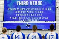 The third verse ("Here's a toast...") has a different melody, and a more reverent mood than the rest of the song to commemorate those who have fallen in the service of the Air Force and the United States. This verse is sometimes performed independently of the other verses. The third verse is sung by itself after most Academy sporting events, with the entire Cadet Wing participating after a football game. It is sung in conjunction with Army's Alma Mater and Navy's Blue and Gold, when the teams combine to participate in the singing of both Academies' songs. The third verse is also traditionally sung by Academy cadets and graduates as an alma mater to honor the passing of a fellow cadet or graduate.