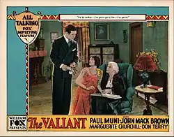 The Valiant is a 1929 American sound (All-Talking) pre-Code drama film released by Fox Film Corporation in the Fox Movietone sound-on-film system on May 19, 1929.[1] It is produced and directed by William K. Howard (his first sound film) and stars Paul Muni (in his film debut), Marguerite Churchill (in her feature film debut), and John Mack Brown. Although described by at least one source[2] as a silent film containing talking sequences, synchronized music, and sound effects, The Valiant has continuous dialogue and is a full "talkie" made without a corresponding silent version.[3]