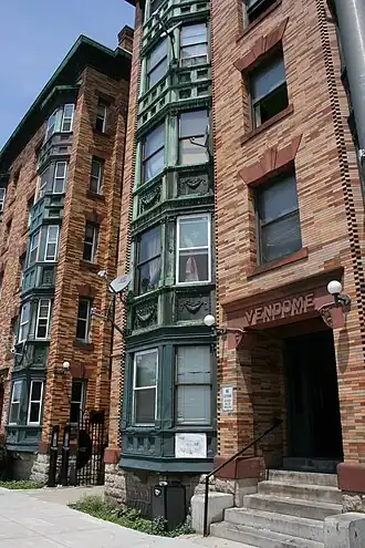 The Vendome and the St. Ives are a pair of historic residential apartment houses in Worcester, Massachusetts. The Vendome (17-19 Chandler) was built in 1898 by Judson W. Hall to a design by the noted local architectural firm of Barker & Nourse, on property where Hall previously had a house. The five-story building is primarily faced in Roman brick, with pressed-metal bay windows, sandstone lintels, and decorative sandstone panels. The St. Ives (21-23 Chandler) was built c. 1913, also for Hall. It is stylistically similar to its neighbor, but is slightly wider, possessing two central window bays where The Vendome has one.[2]