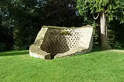 In the grounds is a scheduled ancient monument, a dovecote dating from the 14th or 15th century.[8] Its thick circular walls enclose an area 4.8 metres (16 ft) in diameter. Within the walls there were originally about 500 nest holes where pigeons were bred for meat. At some point before 1920 the roof fell in, "during the owner's temporary absence from the property"[9] followed later by part of the walls.