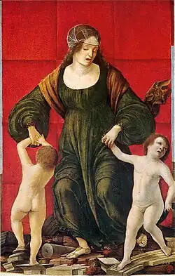 This panel, Brutus, Lucretia and Collatinus and Brutus and Portia were originally part of a series of works depicting famous women of antiquity, probably commissioned by Ercole I d'Este's wife Eleanor of Aragon and referring back to the motto of her father, Ferdinand I of Naples: "Preferisco la morte al disonore" ('I prefer death to dishonor').[2]