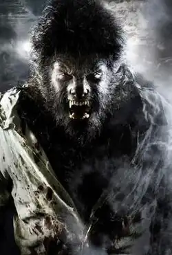 Baker and del Toro were adamant about the design resembling the makeup created by Jack Pierce for the 1941 film, but Romanek went through thousands of concept art renderings. When Johnston signed on, Baker returned to his second design, which is the finished result.[23] The makeup took three hours to apply, and one hour to remove. New pieces of latex prosthetic makeup and loose hair was applied to del Toro's face each day, while several dentures and wigs were created in case some were damaged.[22] Baker said the transformation would likely be computer-generated, which disappointed him as he would not be involved and felt it would look unrealistic (as the animators did not have his knowledge of the design).[24] Director Joe Johnston explained that joining the film three weeks before photography placed limitations on his ability to film without using CG effects. He has stated, “I recognised that there were things that I was going to be able to do from the beginning to the end, and things that I had to rely on post-production for." In reference to filming Benicio del Toro's actual transformation into the Wolfman, Johnston further explained, "I decided to basically shoot just Benicio, in the sequence where he transforms and decide in post-production what I wanted the transformation to be. That was really my main reason [for using CG]; it gave me so much more flexibility."[25] In February 2009, ZBrush art of the transformation by Baker leaked online.[26] In addition to the film, at the 2009 Halloween Horror Nights, Universal Studios Florida added The Wolfman to the event.[27]