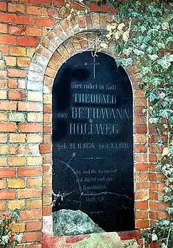 Theobald von Bethmann Hollweg was born at Hohenfinow in Brandenburg, then part of the Kingdom of Prussia, the largest state within the German Empire. He was the son of Prussian official Felix von Bethmann Hollweg. His grandfather August von Bethmann-Hollweg had been a prominent law scholar, president of Frederick William University in Berlin and Prussian minister of culture. His great-grandfather Johann Jakob Hollweg had married a daughter of the wealthy Frankfurt am Main banking family of Bethmann.[1] His mother, Isabella de Rougemont, was a French Swiss and his grandmother Auguste Wilhelmine Gebser came from the Prussian noble family of Gebesee.