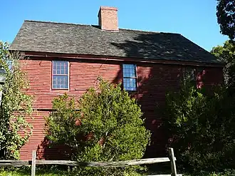 The Theophilus Jones House stands in a residential area southwest of downtown Wallingford, on the west side of Jones Road south of Apple Tree Lane. It is a 2+1⁄2-story wood-frame structure, with a gabled roof, central chimney, and clapboarded exterior. The main facade is three bays wide, with sash windows arranged symmetrically around the center entrance. The second floor has a slight overhang over the first floor, and windows on both levels butt against eaves. The entrance is simply framed, with a multilight transom window above. The interior is a combination of original, recycled, and reproduction finishes.[2]
