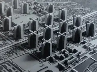 Le Corbusier (1887–1965) pioneered a new urban form called towers in the park. His approach was based on defining the house as 'a machine to live in'.[39] The Plan Voisin he devised for Paris, which was never fulfilled, would have involved the demolition of much of historic Paris in favour of 18 uniform 700-foot tower blocks.[40] Ville Contemporaine and the Ville Radieuse formulated his basic principles, including decongestion of the city by increased density and open space by building taller on a smaller footprint.[40] Wide avenues should also be built to the city centre by demolishing old structures, which was criticized for lack of environmental awareness.[40] His generic ethos of planning was based on the rule of experts who would "work out their plans in total freedom from partisan pressures and special interests" and that "once their plans are formulated, they must be implemented without opposition".[41] His influence on the Soviet Union helped inspire the 'urbanists' who wanted to build planned cities full of massive apartment blocks in Soviet countryside.[41] The only city which he ever actually helped plan was Chandigarh in India.[42] Brasília, planned by Oscar Niemeyer, also was heavily influenced by his thought.[43] Both cities suffered from the issue of unplanned settlements growing outside them.[44]
