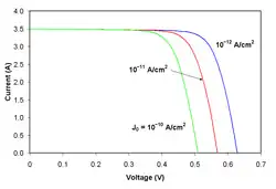 Thus, an increase in I0 produces a reduction in VOC proportional to the inverse of the logarithm of the increase. This explains mathematically the reason for the reduction in VOC that accompanies increases in temperature described above. The effect of reverse saturation current on the I-V curve of a crystalline silicon solar cell are shown in the figure to the right. Physically, reverse saturation current is a measure of the "leakage" of carriers across the p–n junction in reverse bias. This leakage is a result of carrier recombination in the neutral regions on either side of the junction.