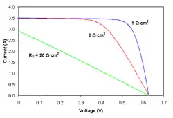 As series resistance increases, the voltage drop between the junction voltage and the terminal voltage becomes greater for the same current. The result is that the current-controlled portion of the I-V curve begins to sag toward the origin, producing a significant decrease in and a slight reduction in ISC, the short-circuit current. Very high values of RS will also produce a significant reduction in ISC; in these regimes, series resistance dominates and the behavior of the solar cell resembles that of a resistor. These effects are shown for crystalline silicon solar cells in the I-V curves displayed in the figure to the right.