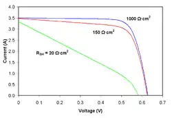 As shunt resistance decreases, the current diverted through the shunt resistor increases for a given level of junction voltage. The result is that the voltage-controlled portion of the I-V curve begins to sag far from the origin, producing a significant decrease in and a slight reduction in VOC. Very low values of RSH will produce a significant reduction in VOC. Much as in the case of a high series resistance, a badly shunted solar cell will take on operating characteristics similar to those of a resistor. These effects are shown for crystalline silicon solar cells in the I-V curves displayed in the figure to the right.