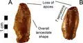 The dentition is another featured trait in therizinosaurids which differs from all theropod groups. At least two different tooth morphologies are observed among therizinosaurids; the first is represented by relatively homodont, oval to lanceolate-shaped teeth with moderate coarse denticles (serrations) on the crowns (upper exposed part). This type of dentition is better represented by the complete, three-dimensional holotype skull of Erlikosaurus which features the mentioned characters.[24] Two isolated teeth are known from Nothronychus and they are lanceolate-shaped, symmetrical, have moderate denticles, and strongly resemble those of Erlikosaurus. Furthermore, they seem to derive from the dentary based on comparisons with the latter.[12] The preserved holotype dentary tip of Neimongosaurus preserves an erupted tooth that is lanceolate-shaped with small coarse serrations, falling within this type of dentition.[8] Another type of dental morphology is the one seen on the highly specialized Segnosaurus. In this taxon, the teeth are very heterodont, leaf-shaped with relatively less denticles that are prominently developed being bigger than in the previous therizinosaurids. These denticles are composed of numerous folded carinae (cutting edges) with denticulated front edges, creating a roughened and shredding surface near the base of the tooth crowns.[25] Most therizinosaurids appear to have had a low tooth replacement rate or not able to loose them at all.[11][26]