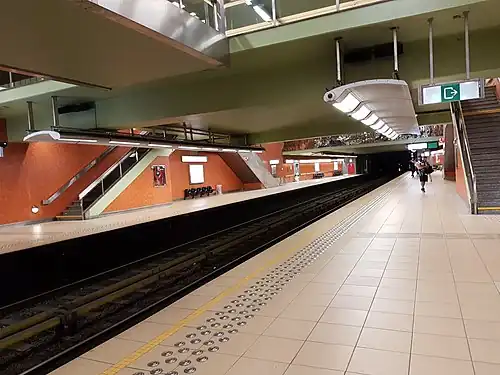 Thieffry (French pronunciation: [tjɛfʁi]) is a Brussels Metro station on the eastern branch of line 5. It is located in the municipality of Etterbeek, in the eastern part of Brussels, Belgium. It is named after the Belgian aviator Edmond Thieffry.