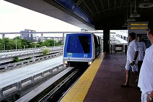 ![]() Brickell Loop train arriving at Third Street, with Metrorail trackage visible in the background. | |||||||||||||||