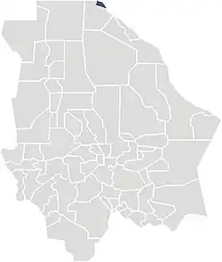 Under the 2023 districting plan adopted by the National Electoral Institute (INE), which is to be used for the 2024, 2027 and 2030 federal elections,[6] the 3rd district covers the western portion of Ciudad Juárez and the municipality of Juárez, together with the adjacent municipalities of Ascensión and Janos, for a total of 366 electoral precincts (secciones electorales).[7][8][a]