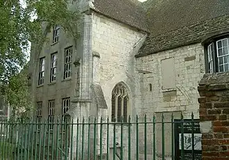 In 1543, following the Dissolution, with part of it having already been demolished, Bell had purchased the site and an adjoining cottage from the Crown.[32] In 1559, by then an old man, perhaps as a final charitable gesture to ease his path to Heaven, Bell built a "Hospital" or almshouse to the east of the cottage, comprising a low terrace of five individual rooms each with its own front door. ("Hospital" in this ancient sense refers to the function of sheltering guests, from the Latin hospes, a stranger, foreigner, hence a guest.) The original cottage itself formed a 6th almshouse, the body of the chapel being used by the almsmen for prayers. Bell drafted his will in the same year leaving it, with endowments to fund its continuation, to the City Corporation. However, 3 years later in 1562, altering his plan, Bell and his wife settled it instead on a body of 10 trustees, among whom were William Bell of Sandhurst his nephew and Thomas Denys, husband of his niece Joan, thus establishing it as a trust, who took possession after the deaths of Bell and his wife Joan in 1566 and 1567 respectively.[33] Under the terms of the trust deed the hospital was to maintain six poor people, one of them, if possible, to be a burgess of Gloucester. Bell and his wife Joan had donated as an endowment for the Hospital the site of Whitefriars Monastery, Morin's Mill in Brook Street, six houses, and the rent of another house, having a total annual value of £16-0s-4d. This was intended to finance quarterly payments of 13s 4d to each of the almspersons.[34] By 1598 the trustees had dwindled in number to only two, one of whom was Denys, having been negligent in making reappointments, and they sought and were granted licence to convey the trust assets to the ownership and management of the Mayor and Burgesses of Gloucester.[35] The assets were so transferred five years later in 1603, by which time Denys was the sole surviving trustee.[36]