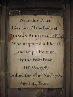 A marble plaque in the church of St Mary the Virgin, Nottingham, records how Berdmore "acquired a liberal and ample fortune by the profession of dentist. He died the 7th Novr 1785, aged 45 years".[2] His will had directed that his epitaph show his fortune had been acquired "by tooth drawing", but the family had found that too indelicate.