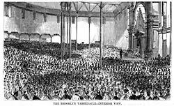 Attending Talmage's sermons became one of the most popular religious experiences of the era. In 1870, the congregation built a tabernacle solely to accommodate the large crowds who attended his church services.[4] The building was built over an old church structure then being used as a Sunday School. The demand for his sermons helped with the raising of funds, and construction was completed in only three months. Although the tabernacle had been built to seat large crowds, seating was free of charge and hundreds were turned away every Sunday.[3]