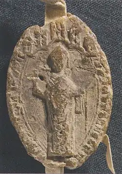 Pope Clement confirmed Thomas' election and sent his pallium on 31 January 1306.[3] Prior to this, Thomas borrowed a lot of money to achieve this goal. According to his promissory note (obligatio) from February 1306, he had to pay 2,000 golden florins as his servitium commune and ten servitia minuta to the Roman Curia.[6] Thomas paid 50 golden florins as part of his servitium commune in 1309.[7] Otto was never able to strengthen his position in Hungary, because only the Kőszegis supported him. Accompanying with Thomas and his troops, Charles seized Esztergom and many fortresses in the northern parts of Hungary (now in Slovakia) in the autumn of 1306. Thomas marched into his emptied seat with his army, which has been plundered and destroyed in recent years.[1] Thomas appointed Peter as Bishop of Pécs at the end of 1306 after the canons did not reach a consensus. However the local oligarch Henry Kőszegi's protege cantor Nicholas contested the appointment and usurped the position and its revenues. Thomas excommunicated the cantor from the church in 1307.[8] Thomas borrowed money in 1307 to repair the cathedral, but renovation works lasted for decades, surpassing his archiepiscopal tenure.[1] Thomas convoked a provincial synod to Udvard, Komárom County (present-day Dvory nad Žitavou, Slovakia) in May 1307. There, he renewed the excommunication of those barons, clergymen and towns, who did not acknowledge Charles as their king. Thomas called all the subjects of the realm to obey the king's commandments, otherwise he was ready to place the whole kingdom under interdict and launch a crusade against the treacherous barons.[9] After Charles' partisans occupied Buda in June 1307, Thomas captured and imprisoned those local pro-Wenceslaus clergymen, who even excommunicated Pope Benedict XI prior to that. The priests died in his prison, according to the Illuminated Chronicle.[5] An assembly of Charles' partisans confirmed Charles' claim to the throne on 10 October 1307, and authorized archbishops Thomas and Vincent to excommunicate those who raise objections to the decision.[10] Meanwhile, Pope Clement also ordered the two archbishops to summon Anthony, Bishop of Csanád before the papal curia, because of his involvement in the coronation of Otto, and to proclaim the papal judgment that Charles is the rightful Hungarian king.[6] Pope Clement V sent his papal legate, Gentile Portino da Montefiore, to Hungary.[10] Charles I and Thomas welcomed him in Zagreb, when he arrived in the summer of 1308.[5] Thomas contributed to the costs of the legate's activities with 431 Buda marks until the autumn of 1311 (the expected amount was 603 marks).[11]